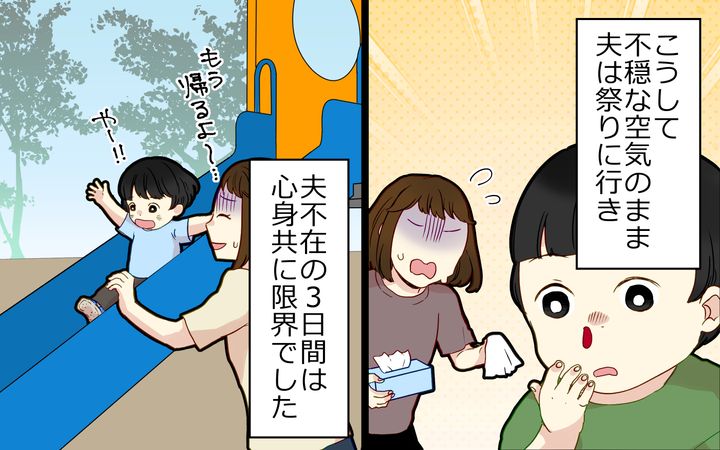 そして私は、仕方なく地獄のような3連休を過ごしました。なのに、帰宅した夫は楽しい気分までも持ち帰ってきて…。私は嫌味しか返せず、夫婦の空気はさらに悪くなってしまいました。