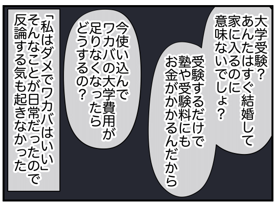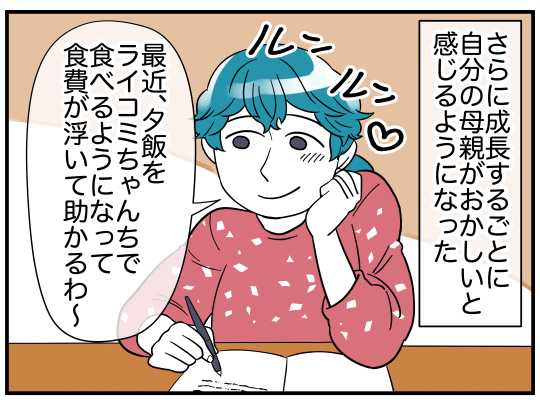 「やっぱり母はおかしいと思う」と言うミズキは、これまで感じてきた圧倒的な姉妹格差と、家族に食費を渡すのは失礼だと謎の発言をするミドリに不信感を抱いていることを明かしました。