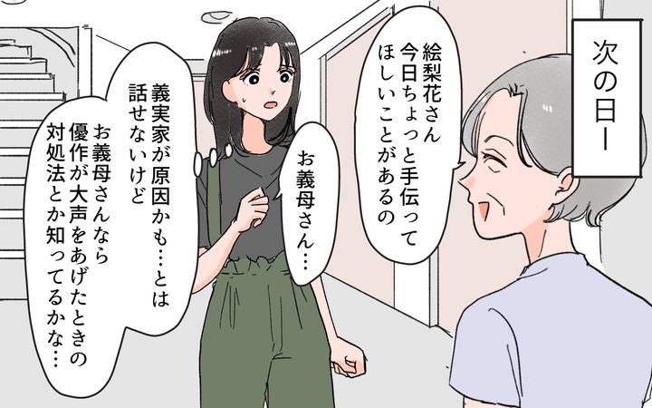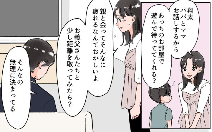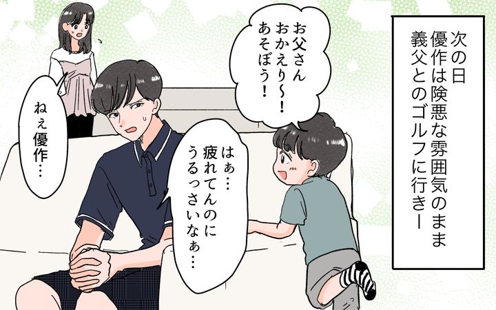 相変わらず義両親の言いなりになる夫。妻と子どもと出かける約束をしていても、義父から誘われたらそちらを優先してしまう。しかも義実家で過ごした日は決まって不機嫌になるのだ。自宅に帰ってくると解放されるのか、不機嫌さがさらに増し、それを子どもや妻にあたることで発散しているように見えるのだった。