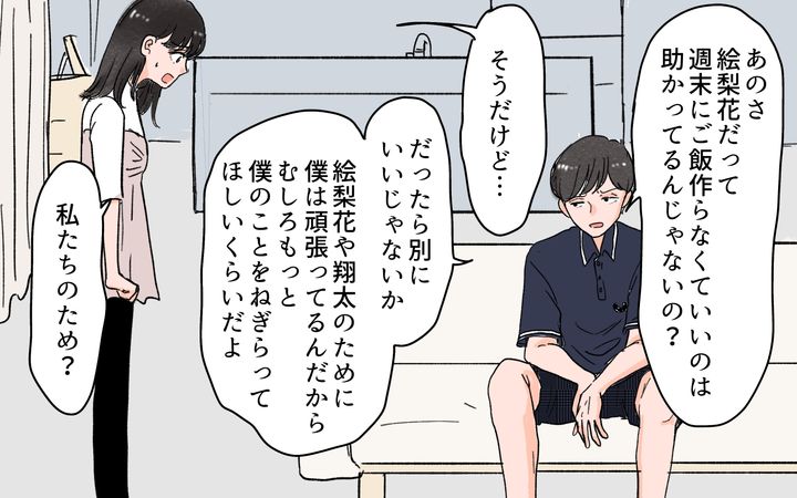 義父とゴルフへ行った夫。ストレスからなのか、自宅に帰って私や翔太に不機嫌オーラを振り撒きます。いつかは変わってくれるかもしれない…と淡い期待を抱きながら過ごしていましたが、夫はまったく変わる様子がありません。