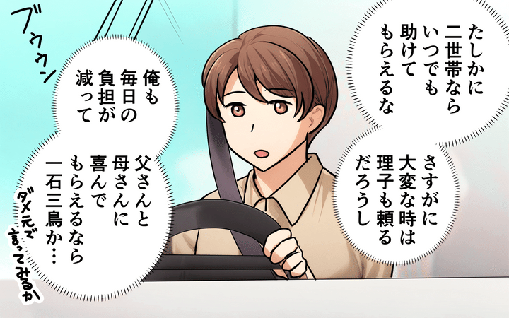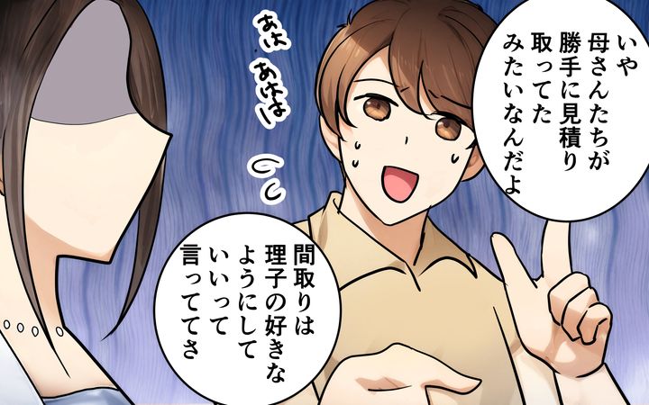あろうことか、母さんは勝手に二世帯住宅の見積書と間取りを作っていました。共働きの俺たちを助けるために同居して、家事育児を手伝いたいんだそうです。俺はいいけど、理子は…。妻の本音をやんわり話すと、母さんなりに悪かったと反省している様子。
