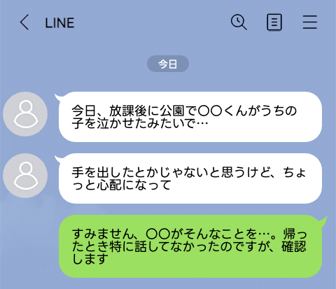 山本ママ:今日、放課後に公園で〇〇くんがうちの子を泣かせたみたいで…