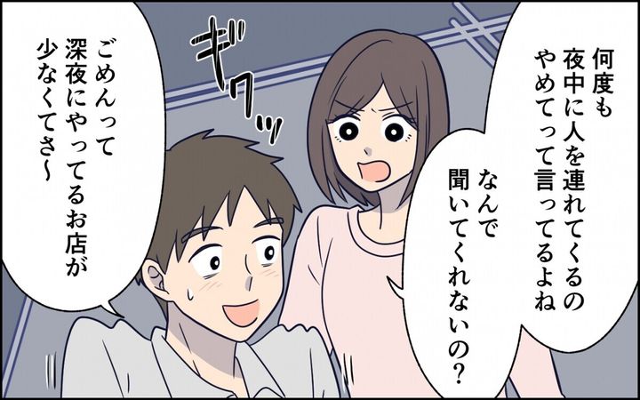 夫の宏樹がアポなしで同僚を連れ、深夜に帰宅。育児で疲れている妻の優花は、作り笑顔で接待するが、夫の無神経な態度に怒りは募る一方。優花は宏樹に「深夜にいきなり人を連れてくるのはもうやめて」と何度も夫にお願いするけれど…