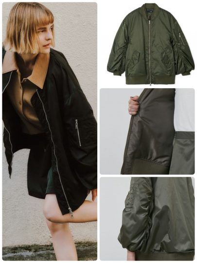 メンズライクなナイロンフライトジャケットは、大きめなサイズ感でラフに着られる1枚です。ミリタリー感がありつつ、ほどよい光沢感で上品さを取り入れらるものうれしいポイント。