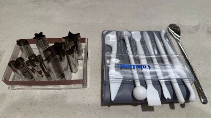 使うのはこちらのキット。型抜きや模様をつける細かいヘラなどがテーブルに並びます。