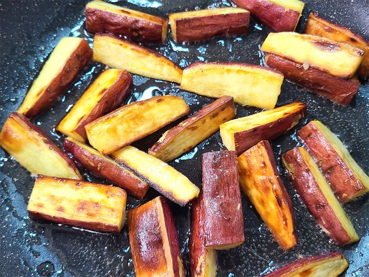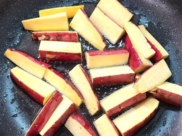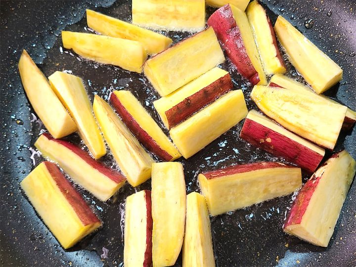 2. フライパンにココナッツオイルを入れて強火で熱し、じっくりとさつまいもを焼きます。パチパチと音がし始めたら中火にしてください。