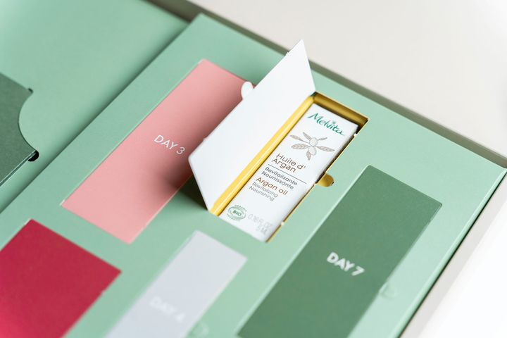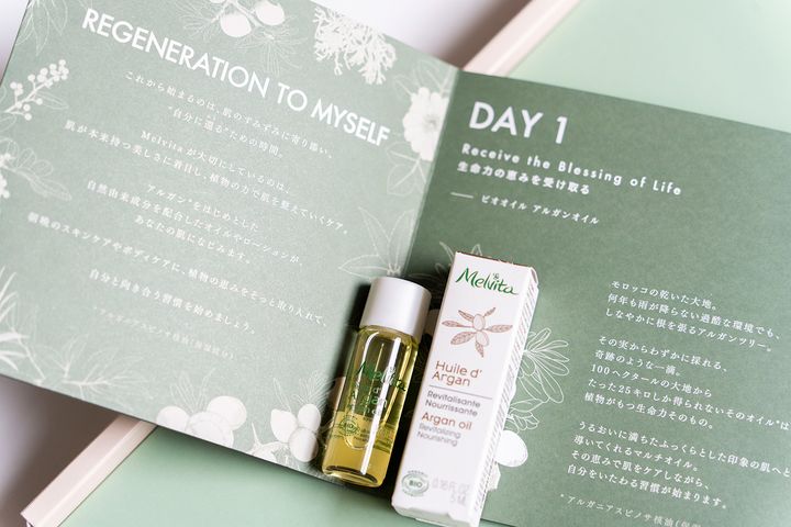 「DAY1」をオープンすると……! 入っていたのは、「ビオオイル アルガンオイル 5mL」。ふっくらとしたハリ肌へと導く、オーガニックのアルガンオイル(アルガニアスピノサ核油 ※保湿成分)を配合したメルヴィータのスターアイテムです。