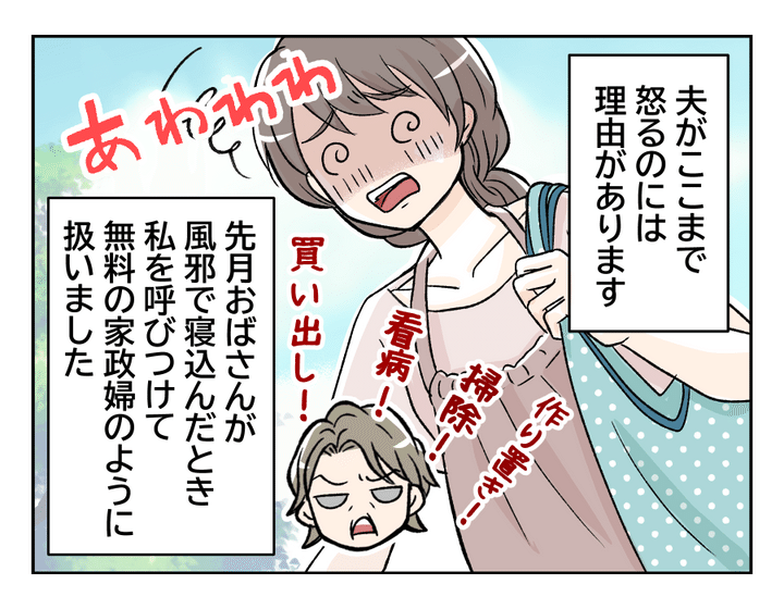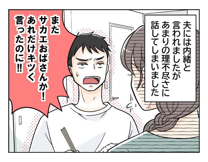 今回の主人公はアラサーの専業主婦のミナさん、二児のママです。夫・ショウジさんとは、学生時代から付き合いはじめて結婚となりました。義両親は遠方に住んでいて、交流は少ないものの優しくおおらかな人で助かっているそう。しかし近所に住む義父の実姉・サカエおばさんはクセ強キャラ。ある日義両親がサカエおばさんの家に泊まることになり、「内緒で」宿泊の支度をやるようサカエおばさんから電話がかかってきました。