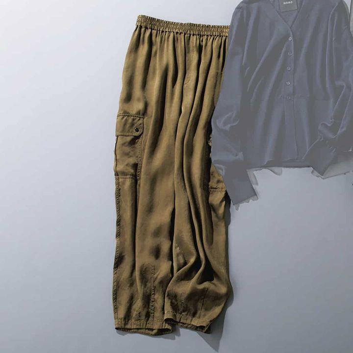 デリケートに見える滑らか素材のサテンのパンツも自宅洗い可。カジュアルなカーキでも光沢と落ち感で女性らしい1枚。サテンカーゴパンツ¥12,100(ミラ オーウェン/ミラ オーウェン ルミネ新宿2 店)
