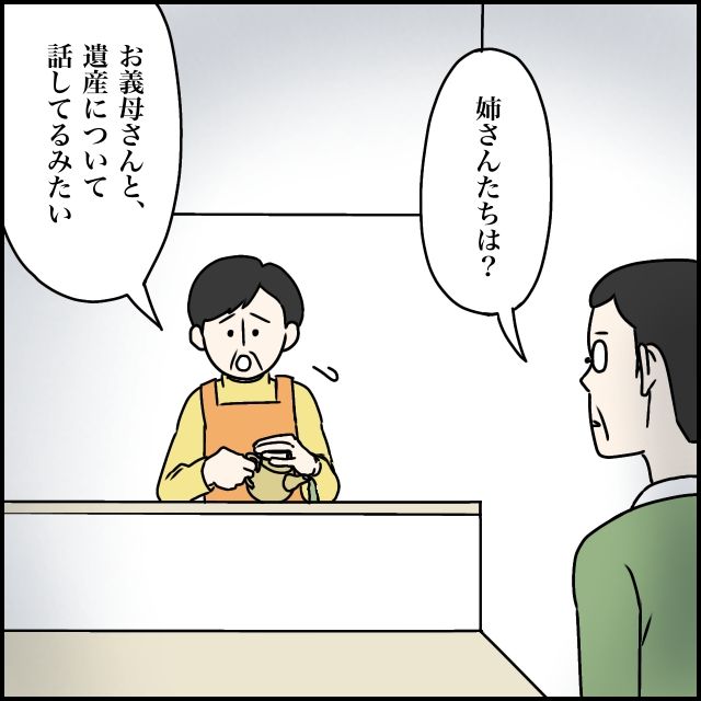 「フフフ、遺産についての話はまとまったわ」「ねぇ、とっても有意義な話だったわよね」と2人ともウキウキ。そんな姉たちを夫が黙って見つめていると、