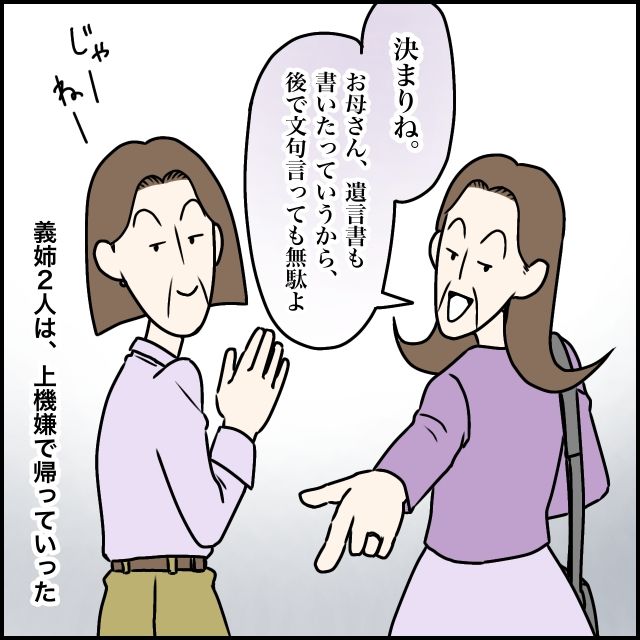 「決まりね。お母さん、遺言書も書いたっていうから、後で文句言っても無駄よ」そう言うと、義姉2人は上機嫌で帰って行きました。