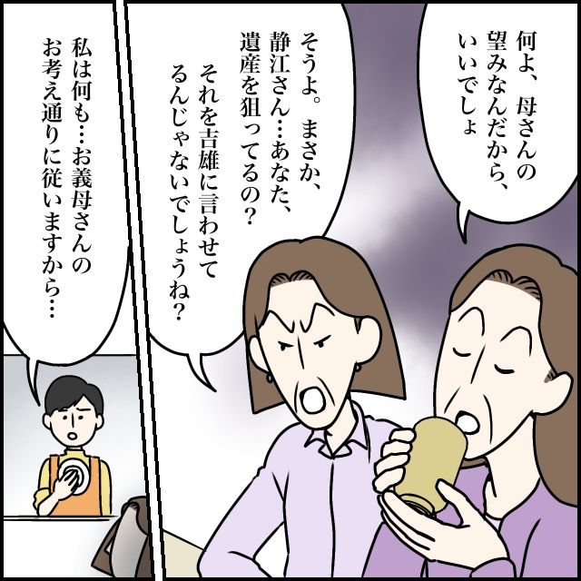 「娘に遺すものの話をするからアンタは部屋から出てて」と言われ少し寂しくなった静江さん。すると部屋から出てきた義姉たちは満足そうに遺産の話を始めました。吉雄さんには家と仏壇、現金と着物などは義姉たち2人で分けると言われ、吉雄さんが動揺していると、静江さんが遺産を狙ってるのでは?と静江さんに疑いが。静江さんが義母の考えに従うと言うと、上機嫌で帰って行った義姉たちの行いを、お天道さまはきっとしっかり見ていますよね。