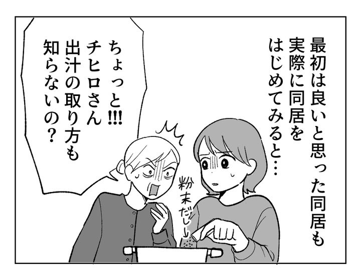 ほら~、言わんこっちゃない……。この漫画を読んでいる皆さんの心の声が聞こえてくるようです。お義母さんにとってレオくんは血縁者ですが、チヒロさんとは赤の他人です。赤の他人同士が一緒に暮らすことの大変さを、もっと同居前にシミュレーションしておくべきでしたね。多くの人はそれがわかっているから、同居に対してあまりいいイメージを持っていないというのに……。チヒロさんやマナブさんが「考えなし」なのか「究極のポジティブ」なのか。これからのお話で見守っていきましょう。