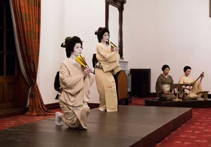 白塗りが立方(こと代)、洋髪姿のお姐さんが地方さんです。見分けやすいですよね。