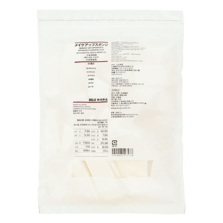 メイクアップスポンジ 40個入り 499円/無印良品 「メイクスポンジはいつもこちらを使い捨てで使用しています。肌触りがなめらかで、ファンデーションや下地がきれいに乗るのが好き。コンパクトなのでポーチにも入れやすく、旅行などにも重宝」(AYANAさん・ビューティライター)
