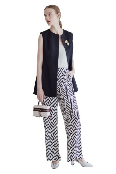 光沢感のあるシルバーのパンプスにこの価格で挑戦できるのもうれしいポイント。安定感のあるチャンキーヒールで歩きやすい。バッグは白とブラウンのクラシカルな配色で、装いを品よく見せたいときに重宝。