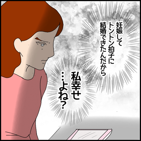 夫も味方してくれず、「妊娠もして結婚もして、幸せなはず…よね?」と、自分に言い聞かせるようにつぶやきます。