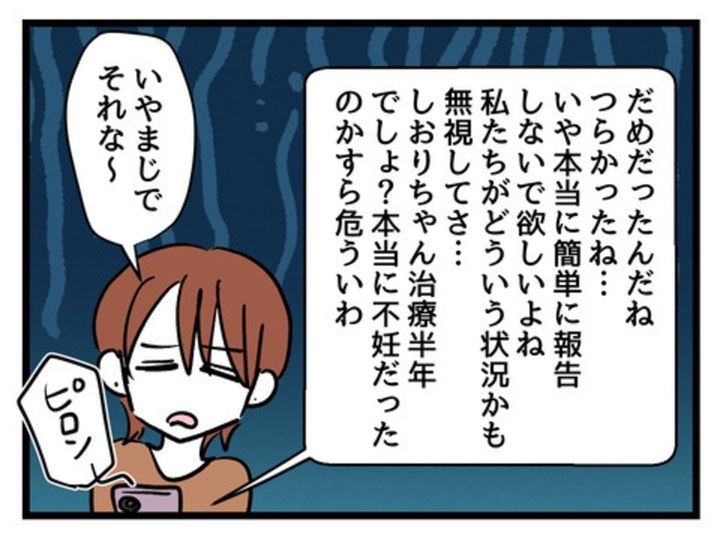 そんな中、不妊治療クリニックで出会った4人仲間のグループLINEに、一通のメッセージが届きます。「報告」とは、何でしょう?
