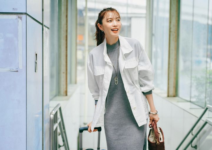 ビスチェ付きニットワンピース(ワンピース)¥3,990/GU シアーブルゾン¥37,400/アンクレイヴ(オンワード樫山) ローファー¥18,150/ダイアナ(ダイアナ 銀座本店) バケツバッグ¥6,996/デッサン(ワールド) ダブルリングネックレス¥7,920/アンタイトル バングル¥2,420/アネモネ(サンポークリエイト) メタルコンビイヤリング¥2,200/Three Four Time(ジオン商事) キャリーケース/スタイリスト私物