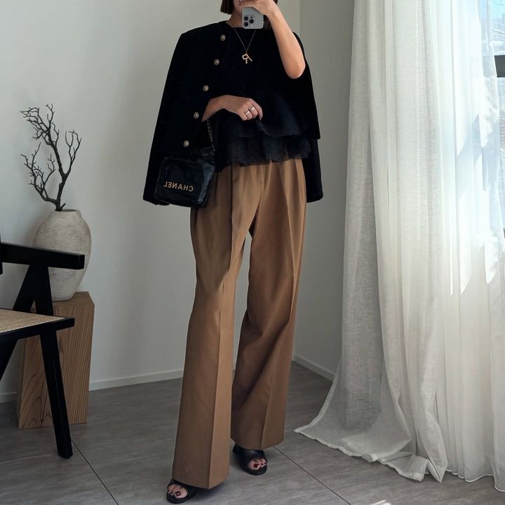 ブラックのトップスとアウターに、ブラウンのワイドパンツを合わせたシックな配色で、大人のきれいめスタイルを完成させています。