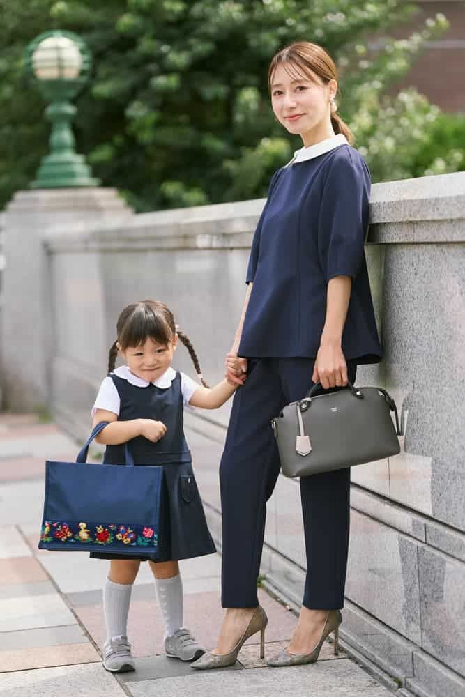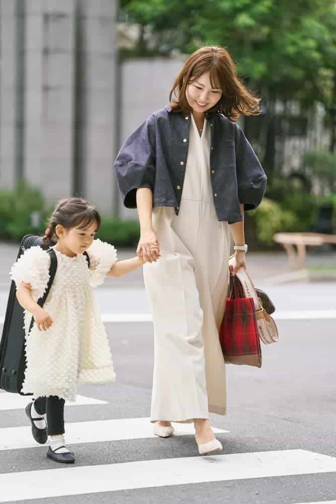 子どもの習い事の日は、きちんと見えて動きやすい万能ネイビーで親子リンクコーデに。娘は白襟ワンピ、私は取り外しできる襟つきトップスで、シーンに合わせてアレンジを楽しんでいます。幼稚園でも人気のフェイラーバッグは、娘にぴったりなサイズ感♡私もハンカチでさりげなくリンクして、楽しんでいます。
