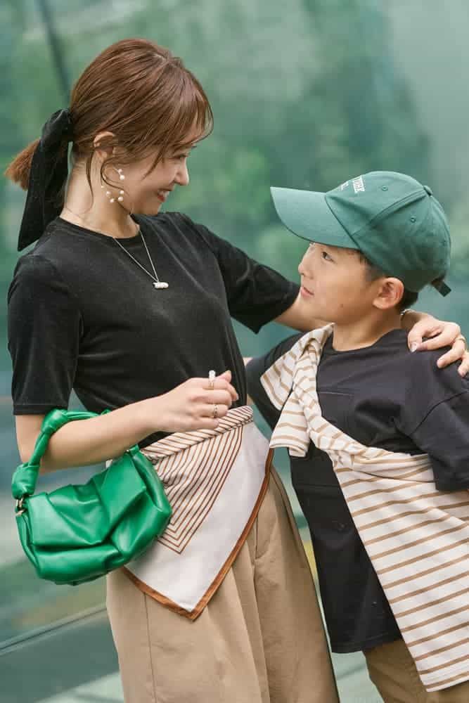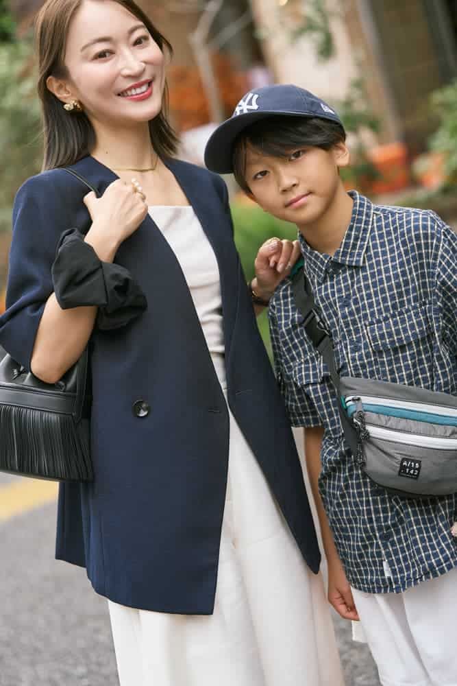 息子と二子玉川で映画を楽しんだあとは、カジュアルなお店でテラスランチを。そんな日の親子コーデは、ネイビー×白でさりげなくリンク。まだ暑さの残る初秋は半袖の日もありますが、私はベロア素材のインナーやゴールドアクセ、息子はデニムジャケットを羽織るなど秋らしさも意識した親子コーデに。気取らないおしゃれをして、秋ならではのお出かけを楽しみます。