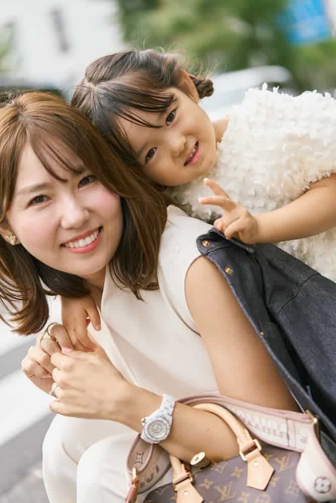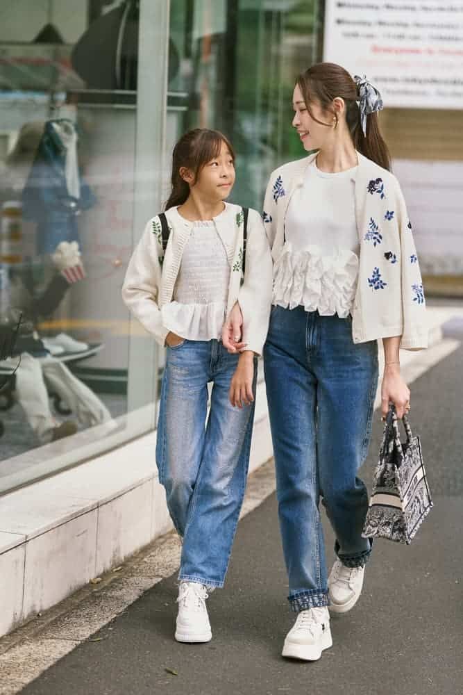 親子で銀座にお出かけをする時は、リンクしながらも気取りすぎないきれいめカジュアルが理想です。白×デニム、ポニーテールで爽やかにまとめ、上品さと抜け感を意識。娘はグリーンの刺繍とバックパックで可愛いカジュアルに、私はブルーの刺繍とブックトートで綺麗めな大人カジュアルに仕上げています。お揃いのカーディガンが映える爽やかコーデで銀座のルワンジュ東京での時間を楽しみます。