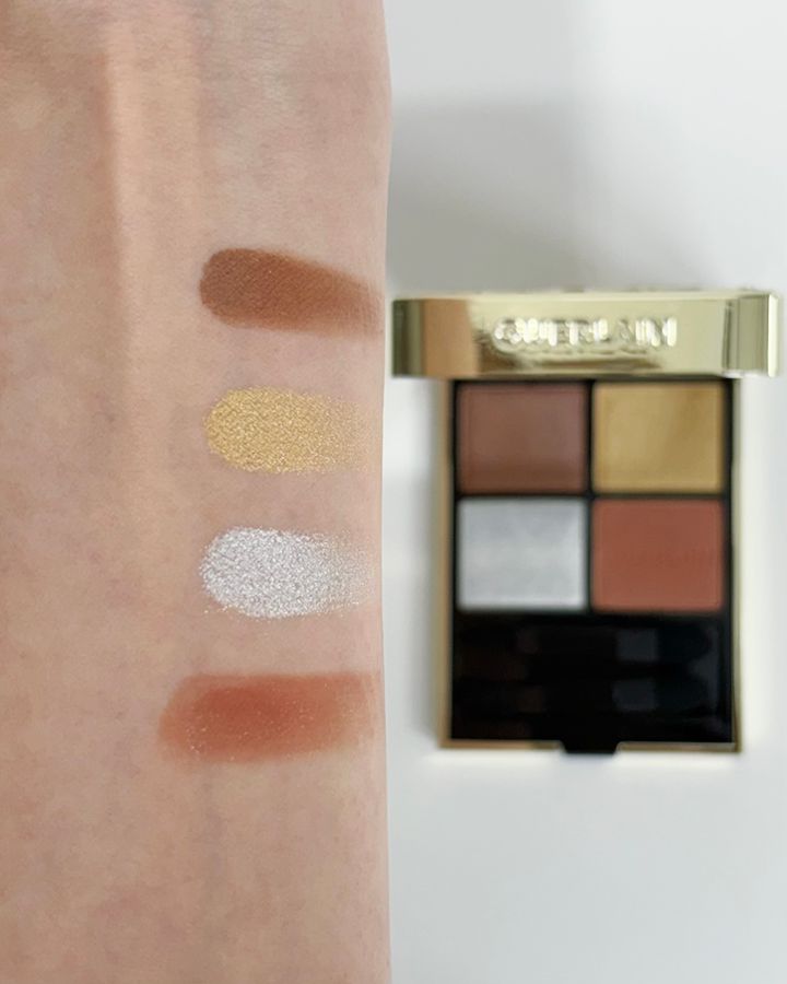 シマーゴールド、スパークリングシルバー、ウォーム ヌード、ブラウンのニュアンスが重なり合い、華やかで煌めく目元に。