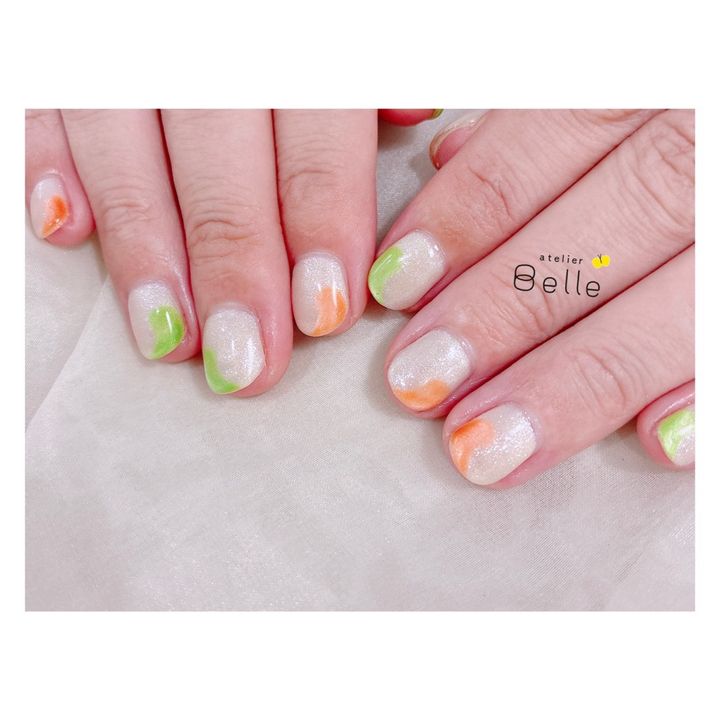 【爽やかニュアンスネイル】オレンジ×グリーンでカラフルな指先に