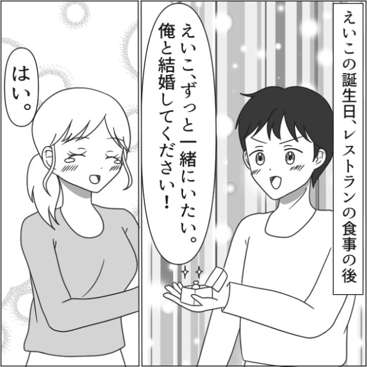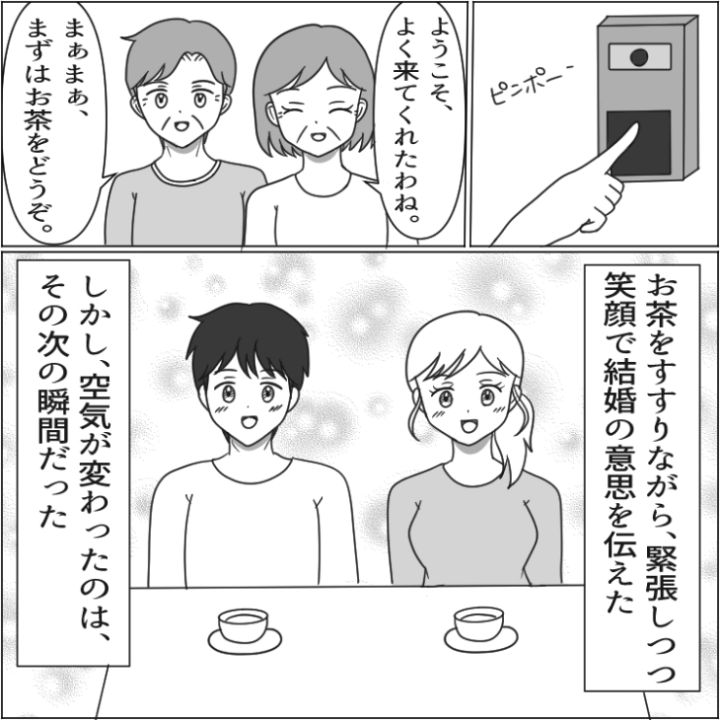 主人公は付き合った3年になる彼氏にある日、プロポーズされました。もちろんOKして婚約者の家に挨拶に行ったら・・・。