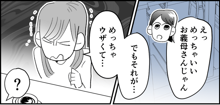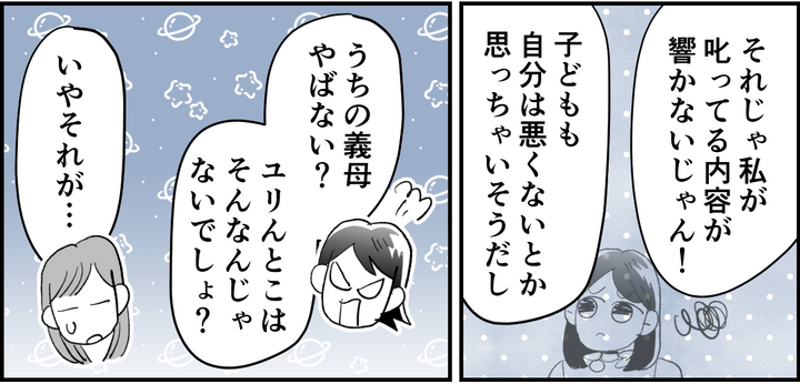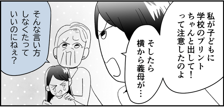 私も義両親と一緒に暮らしています。義父はもの静かで顔を合わせない日もあるくらいなのですが……。 私の義母は、今愚痴を聞いているモモコの義母とは真逆のことをします。真逆というのは、孫の味方について嫁と対立するのではなく、私を擁護して子どもに注意をするのです。
