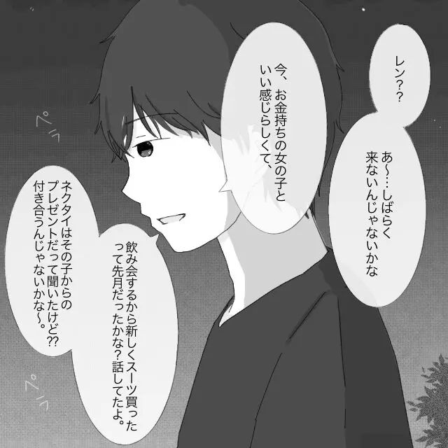 すると、アツシくんは「レン??あ~・・しばらく来ないんじゃないかな。今、お金持ちの女の子といい感じらしくて、飲み会するから新しくスーツ買ったって先月だったかな?話してたよ。ネクタイはその子からのプレゼントだって聞いたけど??付き合うんじゃないかな~」と聞いてもいないことまでペラペラと話してきました。