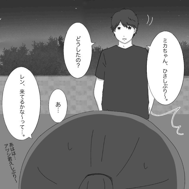 振り向くと、レンの友達のアツシくんでした。「ミカちゃん、ひさしぶり~。どうしたの?」と聞かれ、「あ・・レン、来てるかな~って・・」と返しつつも、昔アツシくんから「レンといて悲しくならない?」と言われたことがよみがえってきてなんとなく気まずい私。