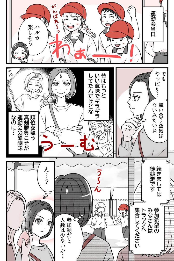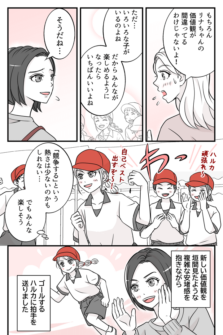 私はリナ、旦那と力を合わせて小5の娘ハルカを育てています。娘が持ち帰った運動会プログラムを見て、徒競走が「希望制・順位なし」となっていることにモヤモヤしてしまいました。競い合う楽しさが醍醐味なのに、何のためにやるのでしょうか……。しかし後日、ママ友のミサキちゃんから「息子が運動会前のプレッシャーで毎年体調を崩していた」という話を聞いて、私は衝撃を受けました。ミサキちゃんは希望制こそがわが子にとっては救いだと安堵していました。とはいえ、やはりすぐには受け入れられませんでした。