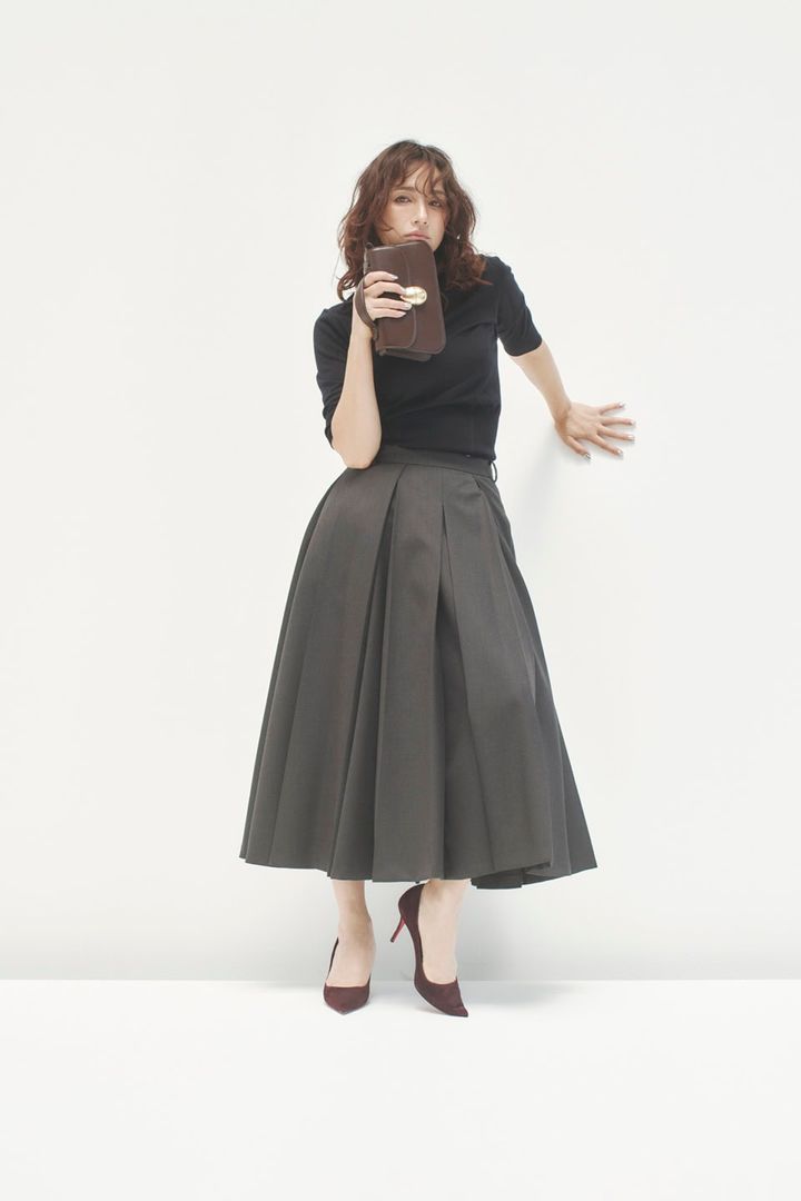 スカート¥80,300(エブール/リトルリーグ インク)、ニット¥24,200(エストネーション)、バッグ¥165,000※参考価格(ネオス/共にザ・ウォール ショールーム)、シューズ¥137,500(クリスチャン ルブタン/クリスチャン ルブタン ジャパン)