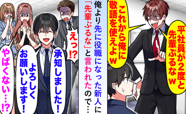 私が「そんな言い方は、西支店の皆に失礼だよ」と返しても、A男は意に介さず、「君はまだ一般営業だろ? これからは俺が先輩になるんだから、敬語を使えよ!」とまで言いだしました。