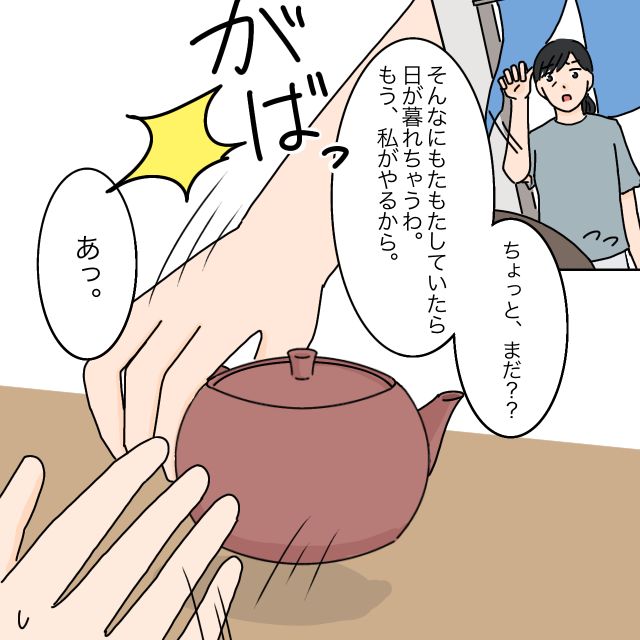 義母は私にお茶を淹れるよう指示を出すと、さっさとキッチンから出て行ってしまいました。私は勝手が分からず戸惑っていると、戻ってきた義母が「ちょっと、まだ??そんなにもたもたしていたら日が暮れちゃうわ。もう、私がやるから」と言いながら私の手からガバッと急須を取り上げました。私は義母がお茶を淹れるのを黙って見ているしかありませんでした。