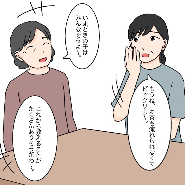 すると、義母がひとりの女性の隣に座りながら「もうね、お茶も淹れられなくてビックリよ~」と話し始め、女性が「いまどきの子はみんなそうよ~」と笑顔で返すと「これから教えることがたくさんありそうだわ~」とやれやれといった感じで言いました。