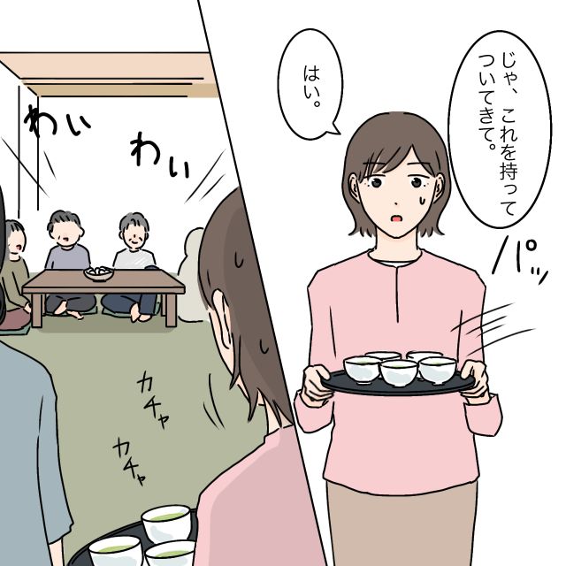 お茶を淹れ終えた義母は、今度は「じゃ、これを持ってついてきて」と言い、私は言われるがままお茶を持って義母の後をついて行きました。義母について和室へ入ると、そこには親戚の人たちがたくさん集まっていました。