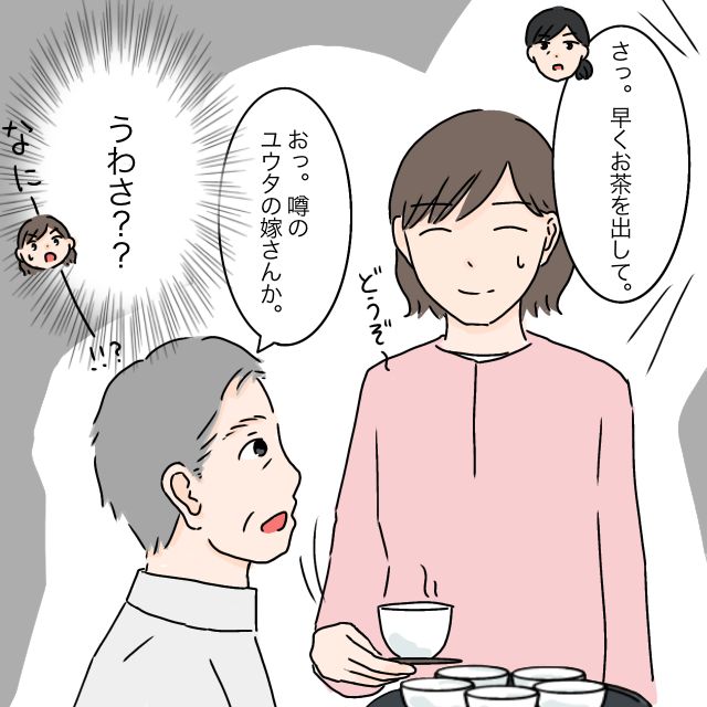 義母は親戚たちに私を紹介することもなく「さっ、早くお茶を出して」と一言。私は何も分からないまま、まずは目の前の男性に「どうぞ~」と引きつる笑顔でお茶を出すと、その男性が「おっ。噂のユウタの嫁さんか」と言いました。うわさ??うわさってどんなうわさ??私は心の中でヒヤヒヤです。