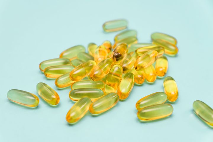 Fish oil supplement, medical and health concept, Soft gel gapsules on blue background