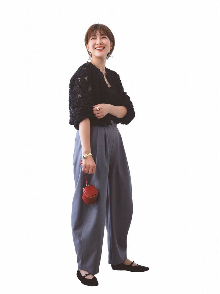 パンツ¥22,000(カデュネ/カデュネ プレスルーム)ジャケット¥44,000〈エストネーション〉ニット¥38,500〈コラム〉(ともにエストネーション)バッグ¥20,900(マユコ)靴¥35,200(ペリーコ サニー/アマン)ピアス¥77,000(カラットアー/イセタンサローネ東京)ネックレス¥22,000(マリハ)リング¥22,000(ete)