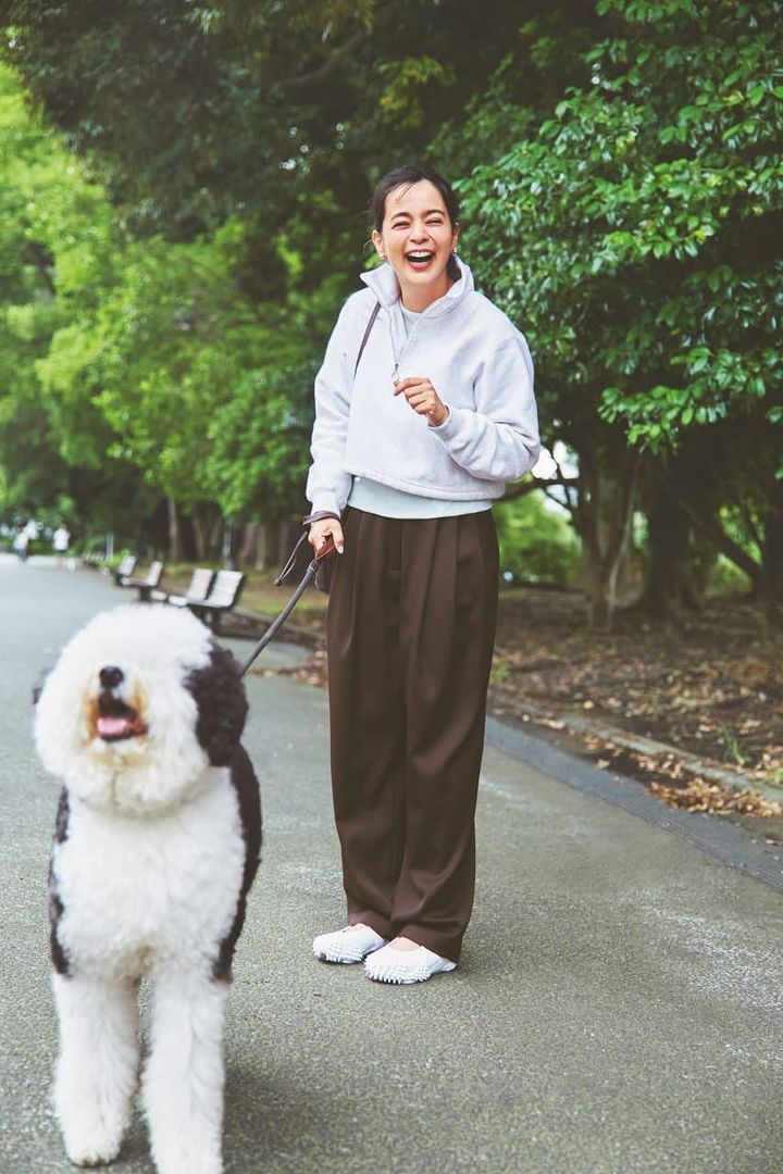 リラクシーなスウェットも、短丈なら重心が上がり好バランス。落ち感のあるブラウンパンツが縦ラインを強調して、脚長に見せます。足元は白シューズで抜けをプラスし、こなれ感たっぷりに。