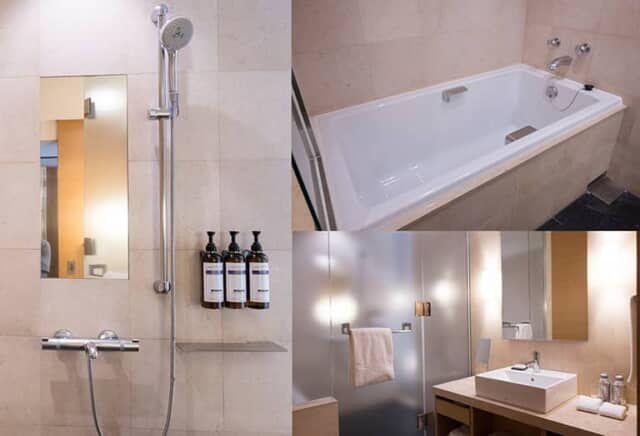 バス・トイレ・洗面はそれぞれ独立していて、御影石のバスルームには深めのバスタブと洗い場があります。バスアメニティーはカナダのオーガニックブランド「ファーマコピア」を採用。すべての客室にバスローブが用意されています。