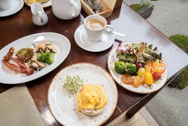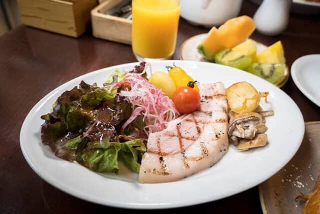 朝食は多くのゲストで賑わっていました。運よく窓際の席に座れると枯山水の日本庭園が眺められます。朝食の定番、ソーセージやベーコンをはじめ、ブロッコリーやジャガイモ、しめじなどグリル野菜が充実。デニッシュパンやフルーツ、国産豚「レッグハム」など、多彩な料理を用意します。