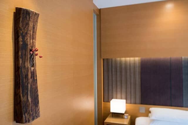アクセントウォールや窓まわり、家具などに白木を使い、落ち着いた色調で構成された親しみのある客室です。最もコンパクトな客室タイプですが、28平米とゆとりのある広さ。幅180cm × 長さ203cmのベッドとデスクが置かれ、2名まで宿泊可能。和紙でできた行灯風のフロアライトに趣を感じます。