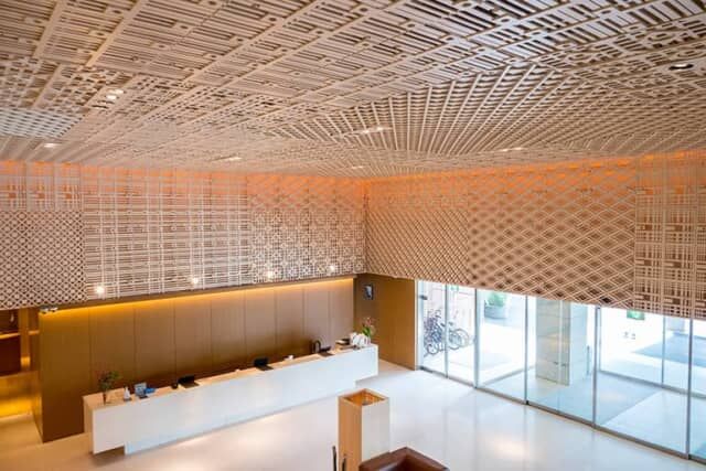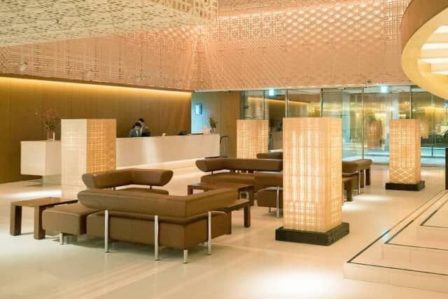 ホテルの内装を担当したのは、国内外のラグジュアリーホテルや店舗などを手がける故杉本貴志氏が興した設計事務所「スーパーポテト」。“コンテンポラリー・ジャパニーズ(現代的な日本の美)” をテーマに、ロビーの天井には “組子” をモチーフに日本の伝統文様、七宝や入子菱、子持縞などの装飾を施した金属製の格子を張り巡らせ、透き通るような白い造形は壮大で圧倒的。息を飲む光景です。