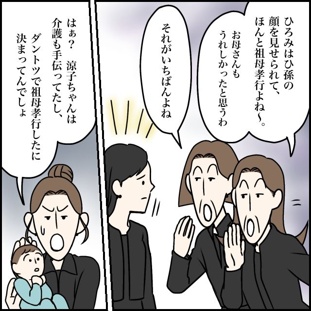 すると、「ひろみはひ孫の顔を見せられてほんと祖母孝行よね~。お母さんもうれしかったと思うわ」「それがいちばんよね」と涼子に向かって嫌味を言う義姉たち。