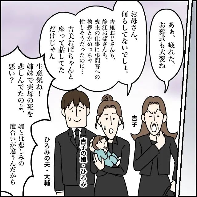すると、「あぁ、疲れた。お葬式も大変ね」と文句を言う吉子さんに、「お母さん、何もしてないでしょ。吉雄おじさんも静江おばさんも、喪主の仕事に弔問客への挨拶とかめっちゃ忙しそうだったのに・・。吉美おばちゃんと座って話してただけじゃん」吉子さんの娘ひろみちゃんがそう言うと、「生意気ね!姉妹で実母の死を悲しんでたのよ、悪い?嫁とは悲しみの度合いが違うんだから」と吉子さんが怒り出しました。