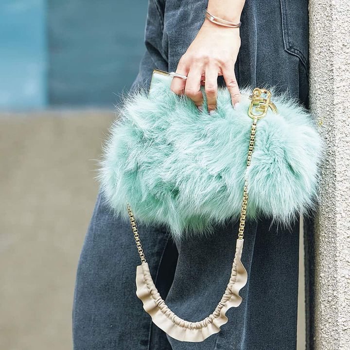 「白T×デニムのカジュアルコーデの外しにミント色のファーバッグをプラス。カラーとファーでコーデに洗練感と華やぎを追加します」